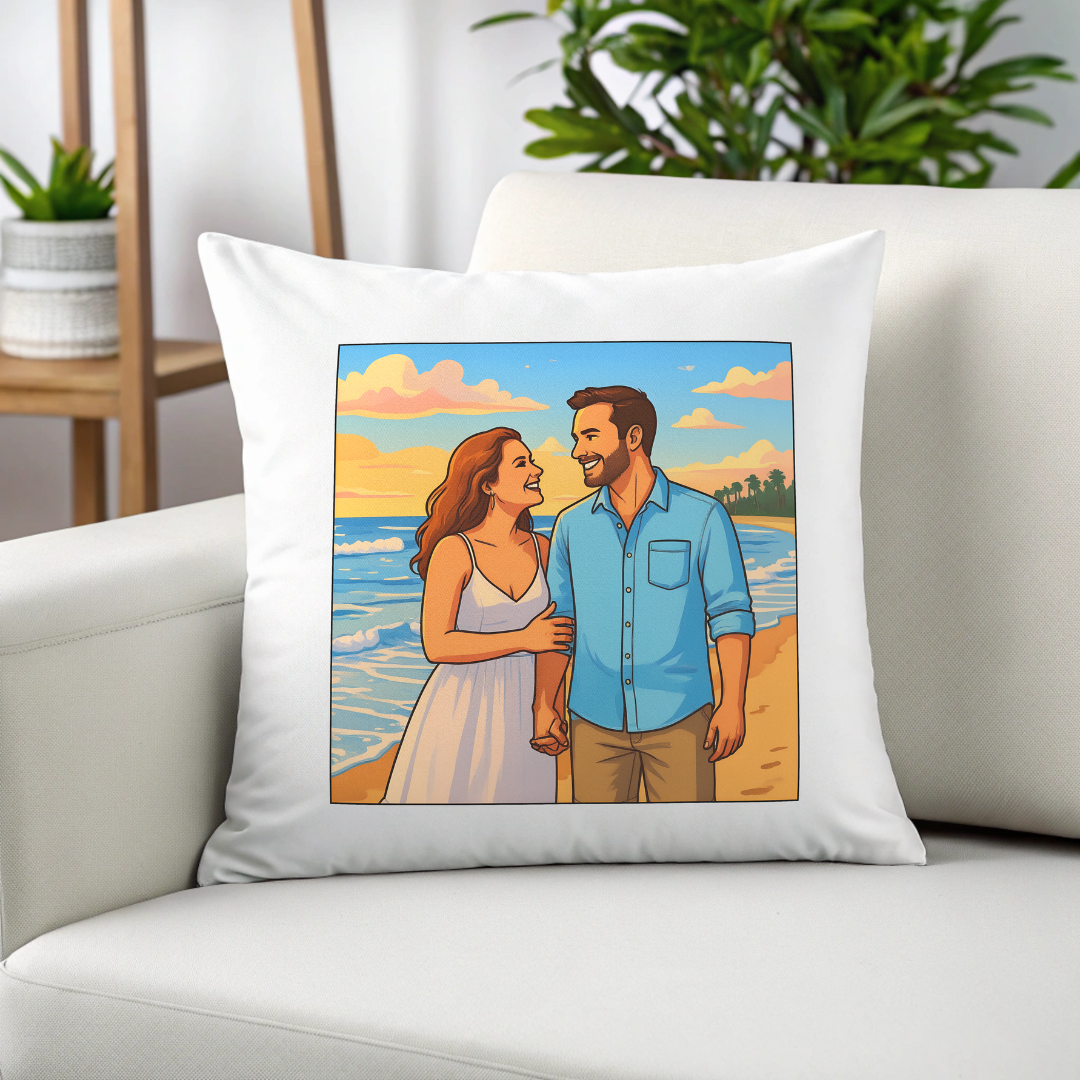 ¿Tienes esa foto especial que te hace sonreír cada vez que la miras? La convertimos en una ilustración digital exclusiva y la plasmamos en un cojín. No es solo un cojín; es ese momento mágico transformado en un dibujo único que puedes abrazar. Un cojín original ideal para regalar en San Valentín, aniversarios o simplemente para sorprender a tu pareja con un detalle creativo.
